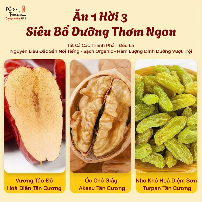 - Được chọn từ táo đỏ, óc chó Mỹ, nho khô Hòa Điền kết hợp hoàn hảo tạo nên món ăn bổ dưỡng, thơm ngon.