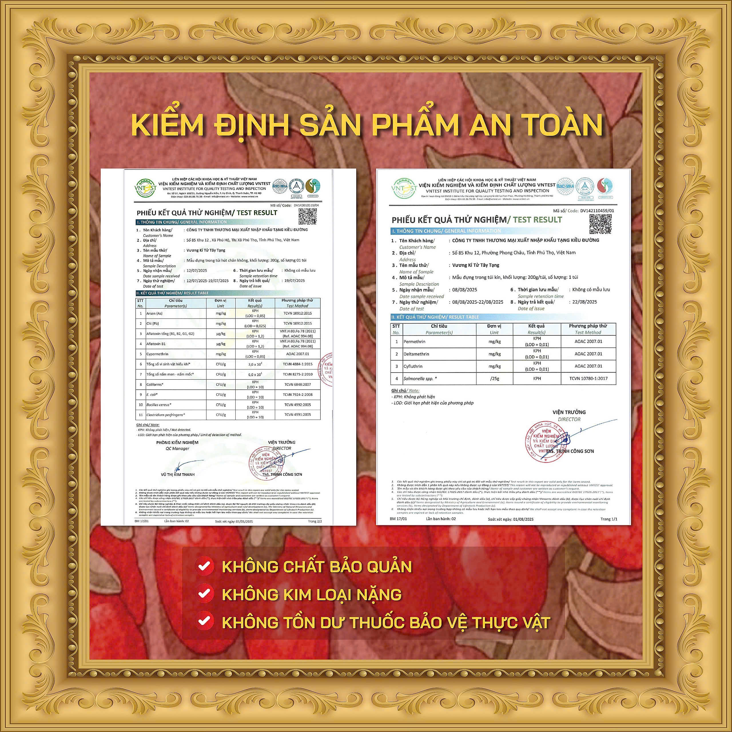- . Sản phẩm đóng gói đạt tiêu chuẩn quốc tế ISO 22000:2018, có kiểm định định kì hàng năm rõ ràng về chất lượng và độ an toàn.