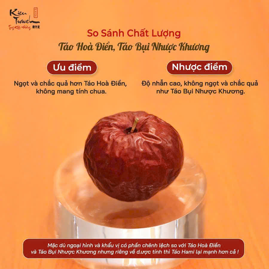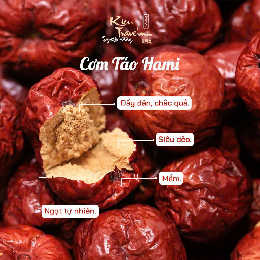 - . Hương Táo Hami là dòng táo có sản lượng rất ít và hiếm, dày cơm nhiều thịt và thơm khá giống táo Nhược Khương nhưng sẽ hơi khô, size táo được chọn lọc từ những quả size lớn nhất và đã được rửa sạch.