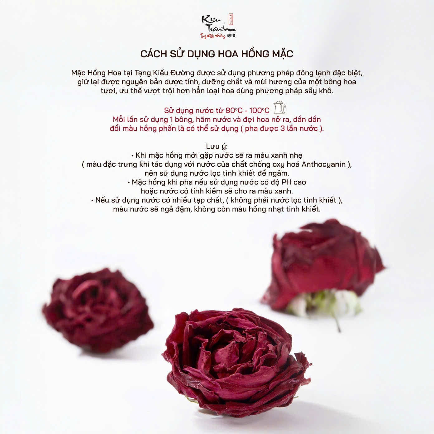 - . Mặc hồng được sử dụng phương pháp đông lạnh dưới -40 độ C để lưu giữ được mùi hương tự nhiên và những chất chống oxy hóa có trong hoa. Đặc biệt sẽ cho ra màu nước hồng tươi rất đẹp, khác với những loại mặc hồng dùng phương pháp sấy khô hoặc phơi khô khác ( màu nước nâu sẫm, ngả đỏ không trong vắt ).