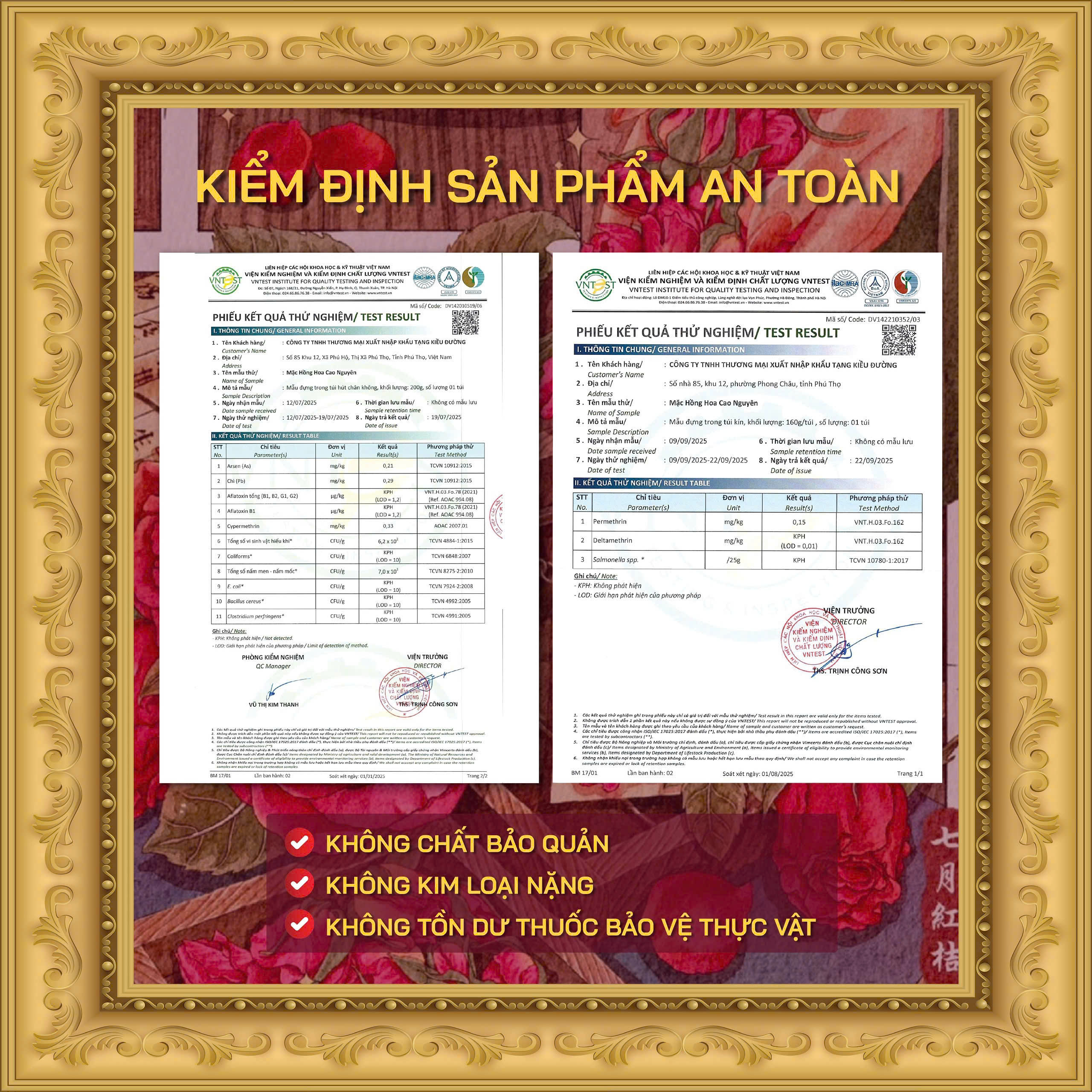 - . Sản phẩm đóng gói đạt tiêu chuẩn quốc tế ISO 22000:2018, có kiểm định định kì hàng năm rõ ràng về chất lượng và độ an toàn.